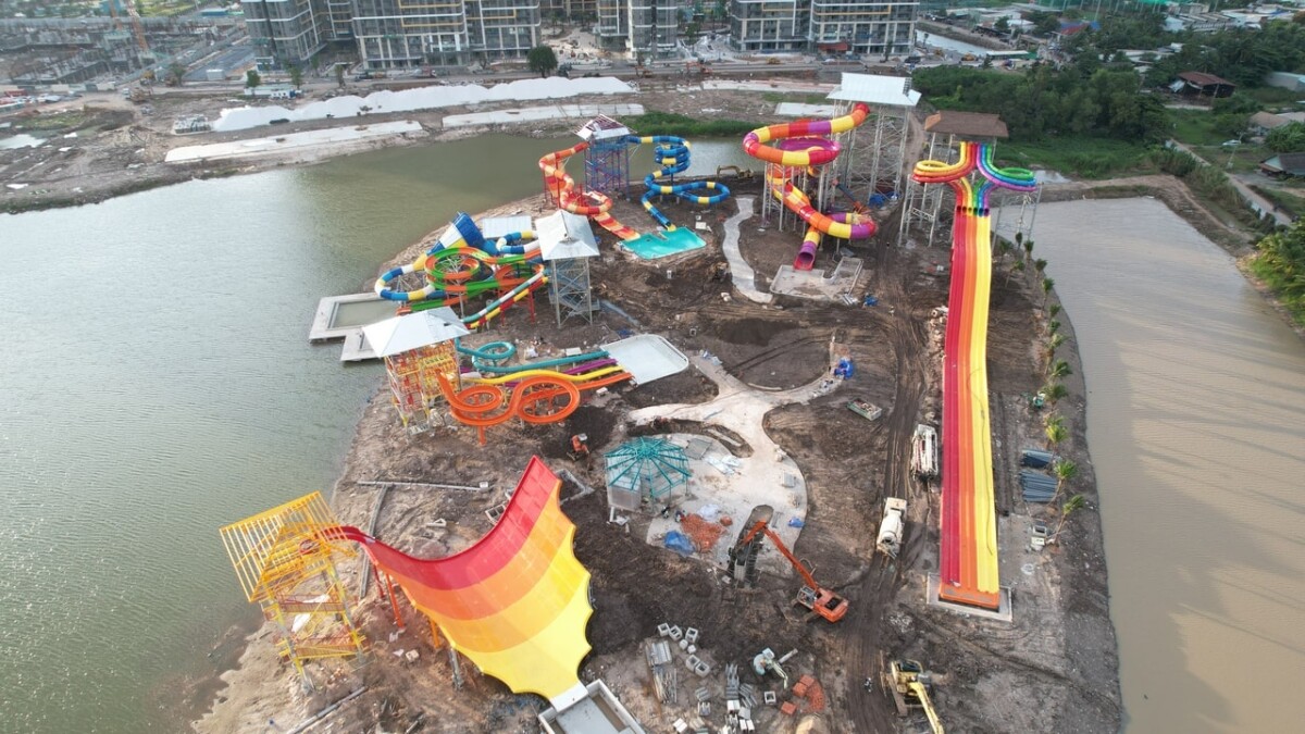 Thi công các hạng mục chính: thi công phần thô (nền, móng, hồ bơi, hạ tầng nước), lắp đặt hệ thống lọc và tuần hoàn nước, xây dựng đường trượt, cầu trượt, khu trò chơi dưới nước, sông lười, bể tạo sóng…