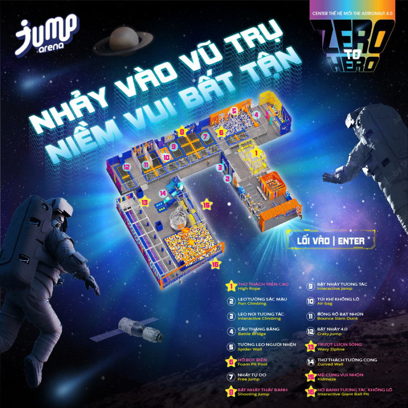 Khu vui chơi sở hữu không gian rộng rãi, an toàn cùng nhiều trò chơi vận động thú vị cho mọi lứa tuổi. Được ví như “The Astrouaut 4.0 với không gian vũ trụ đầy kỳ ảo đến gần 900m2, trung tâm là điểm đến giúp bạn khơi nguồn cảm hứng phiêu lưu, vượt qua mọi nỗi sợ hãi, bứt phá giới hạn bản thân và khai phóng tự do với vô vàn thử thách mới lạ.
