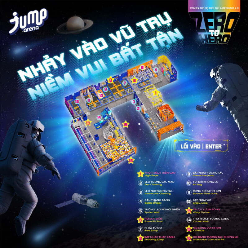 Jump Arena AEON Mall Hà Đông là khu vui chơi giải trí vận động thế hệ mới với concept vũ trụ mới lạ cùng công nghệ game tương tác độc đáo. Được ví như “The Astronaut 4.0” với không gian vũ trụ kỳ ảo đến gần 900m2, trung tâm là điểm đến giúp bạn khơi nguồn cảm hứng phiêu lưu.